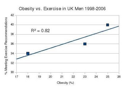 By golly, we've proven that exercise causes obesity! Clearly, the more people exercise, the fatter they get. The R-value is a measure of how closely the points fall on the best-fit line. 0.82 isn't bad for this type of data. If only we could get all British citizens to become couch potatoes, obesity would be a thing of the past! OK, I'm kidding. The obesity is obviously caused by something else. I'm illustrating the point that correlation does not equal causation. Even if an association conforms to our preconceived notions of how the world works, that does not justify saying one factor causes another without testing the hypothesis in a controlled experiment.